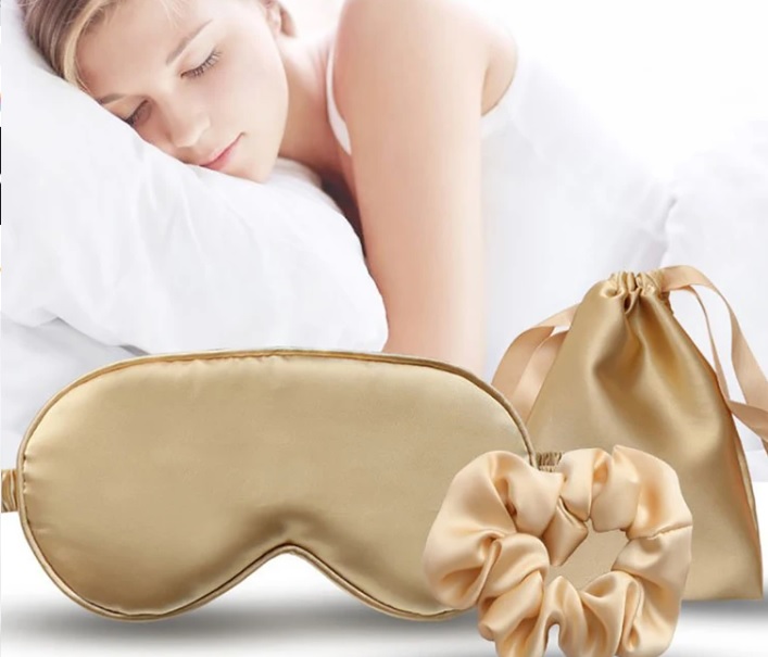 Miego kaukė, plaukų gumytė + maišelis laikymui, aukso spalvos