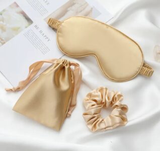 Miego kaukė, plaukų gumytė + maišelis laikymui, aukso spalvos