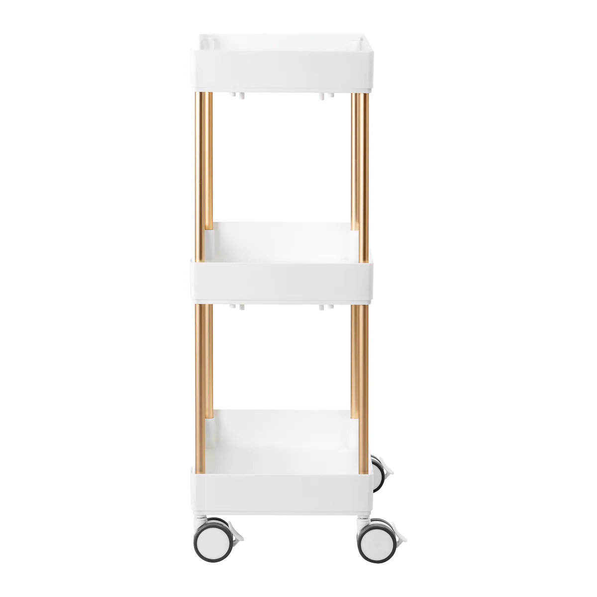 Kosmetologinis vežimėlis su stalčiumi, baltos spalvos su auksiniu rėmu