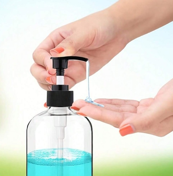 Skaidraus plastiko, su juodos spalvos dozatoriumi indas skysčiams laikyti.