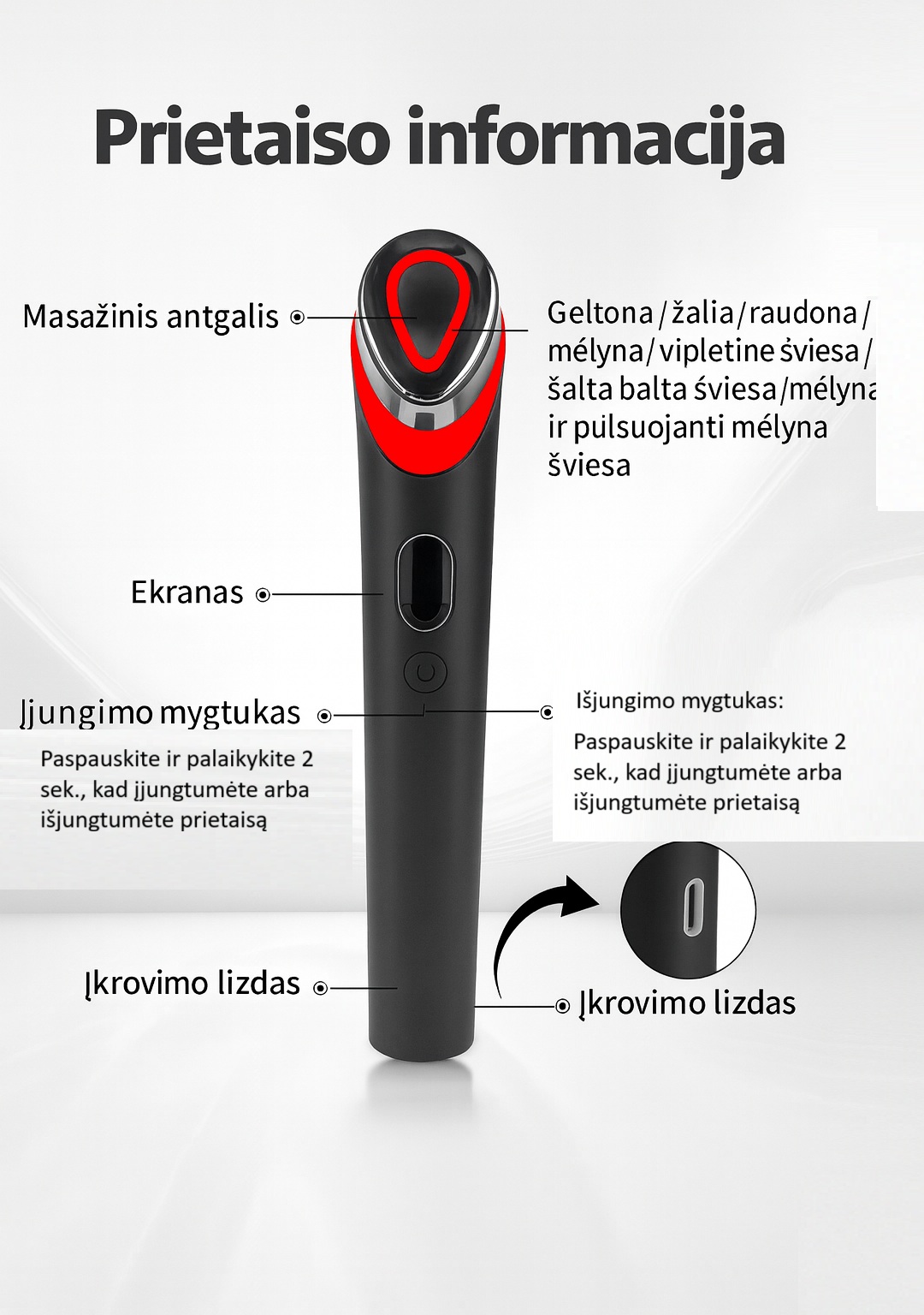 Prietaisą visada laikykite taip, kad prie odos liestų priekine prietaiso dalimi.
