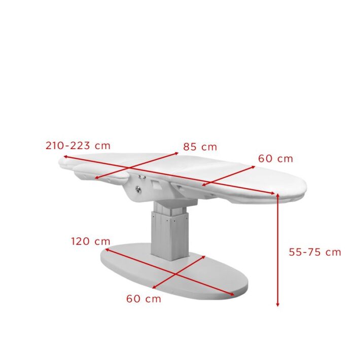 Modernaus dizaino elektrinėje kosmetinėje kėdėje Eclipse yra sumontuotos 3 pavaros , kurios valdomos nuotolinio valdymo pulteliu ant laido. Lengvas reguliavimas leidžia sklandžiai nustatyti padėtį įvairioms procedūroms atlikti, o minimalistinė apdaila tiks beveik bet kokiame interjere. Tai leidžia patogiai atlikti veido ir kūno procedūras. Be to, visiškai ištiestas gultas, jis siekia daugiau nei 2,3 metro ilgį , todėl jis puikiai tinka aukštesnio ūgio žmonėms. Dešinėje sėdynės pusėje yra specialus metalinis laikiklis nuotolinio valdymo pultui pakabinti . Tai palengvina jo saugojimą ir visada po ranka.