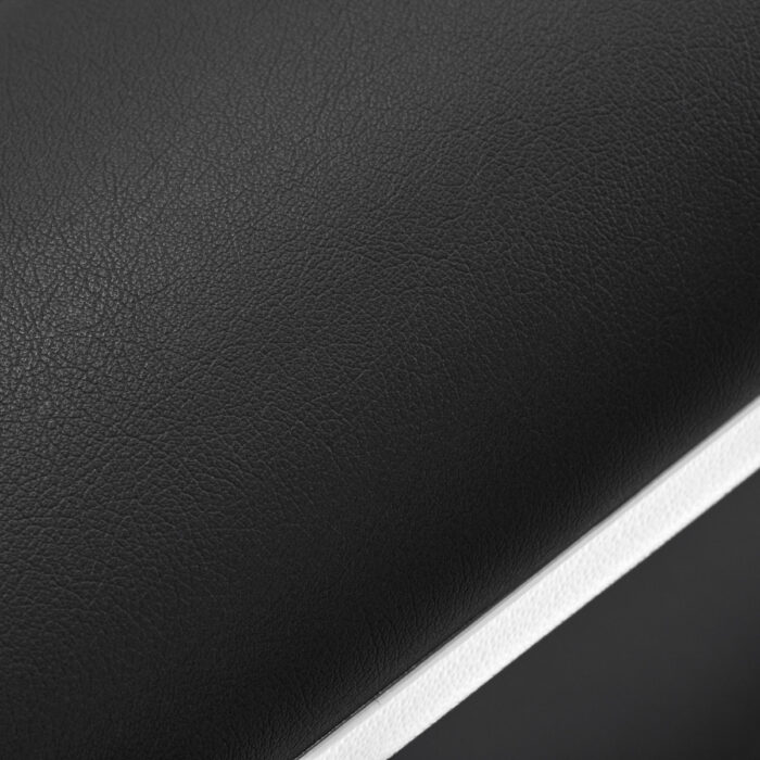 Tvirta bazė užtikrina stabilumą, ilgaamžiškumą ir komfortą dirbant. Kėdė užpildyta putomis ir padengta malonia matinio sintetinio odos imitacija juodos spalvos atspalviais. Tokia medžiaga atspari drėgmei ir lengvai valoma. Apvalios formos ir minimalistinė apdaila suteikia kėdei estetinę išvaizdą, kuri puikiai dera įvairiuose interjeruose.