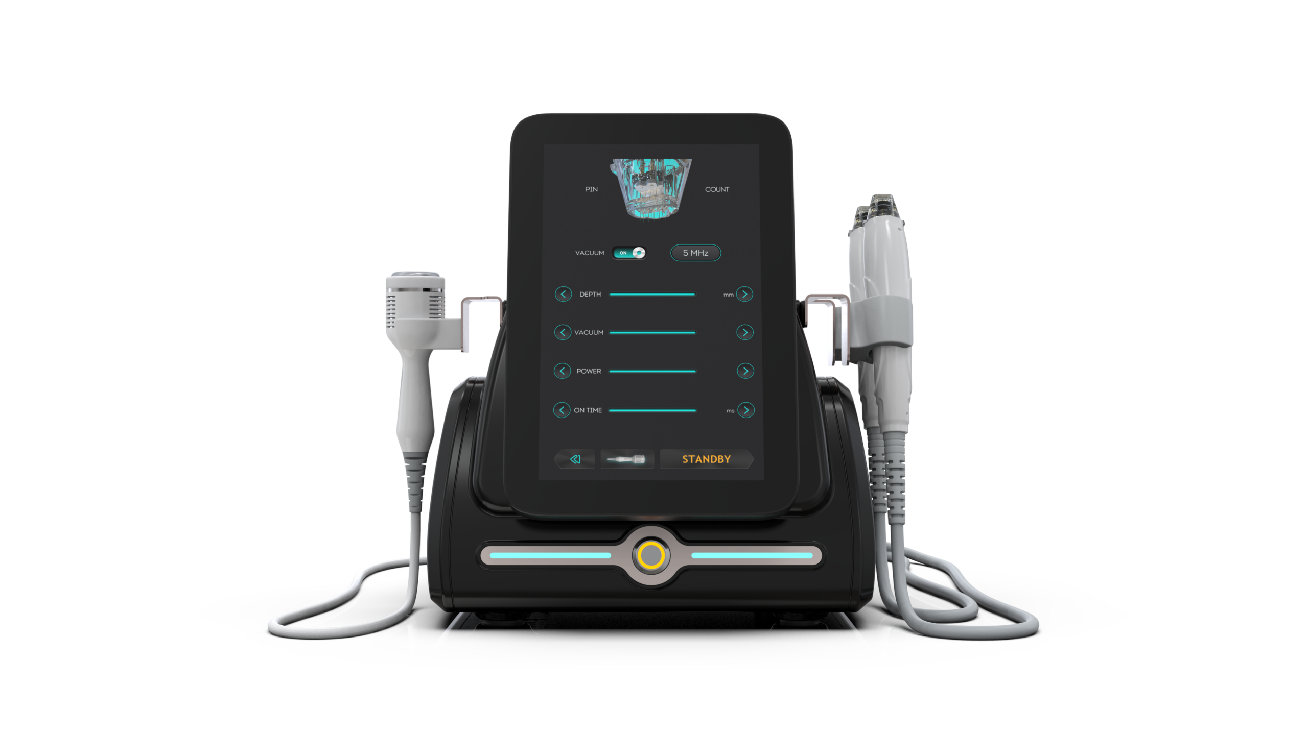 2. Pasirenkamos 5 dydžių adatos procedūroms: 10 adatų, 25 adatos, 36 adatos, 49 adatos, 64 adatos. (Galimas vakuuminis siurbimas siauresnių odos sričių saugesnių zonų procedūroms.)