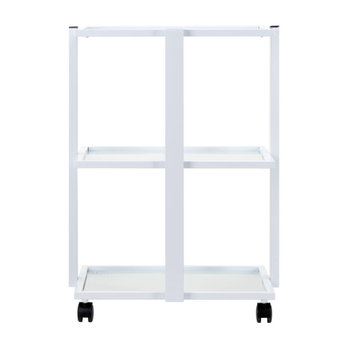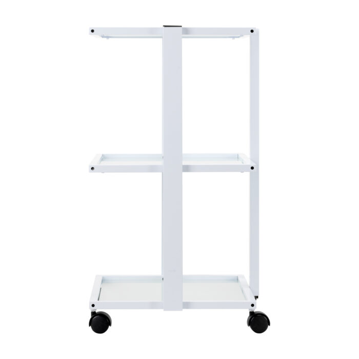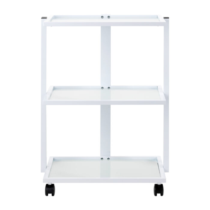 Paprasta konstrukcija, patvarus aliuminio rėmas baltos spalvos atspalviais ir stiklinės lentynos sujungia eleganciją su praktiškumu, užtikrindamos baldų ilgaamžiškumą ir stabilumą. Glotnūs paviršiai palengvina staliuko priežiūrą, o keturi ratukai leidžia jį lengvai perkelti, padidinant darbo komfortą salone. Stilingas apdailos dizainas suteikia profesionalumo interjerui.