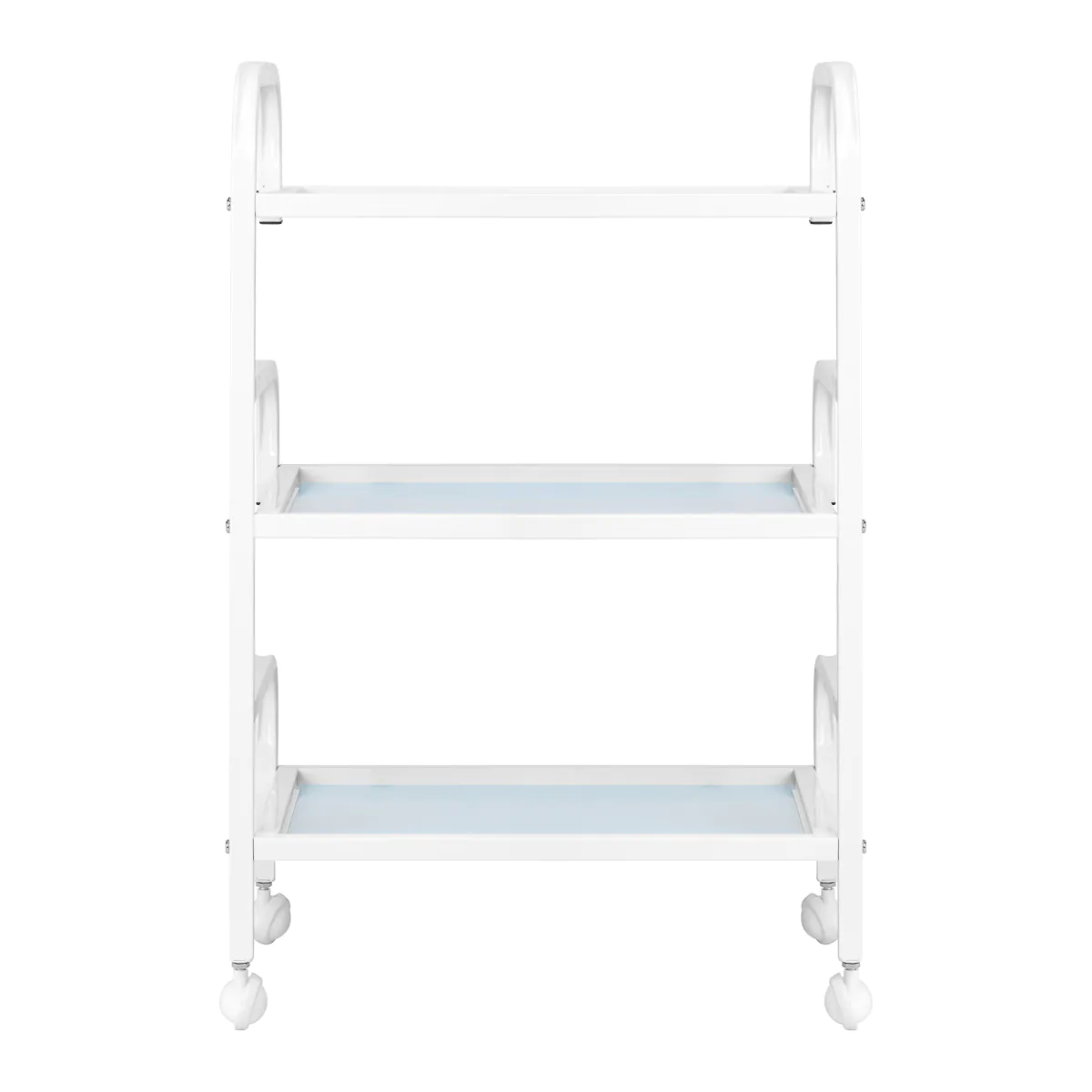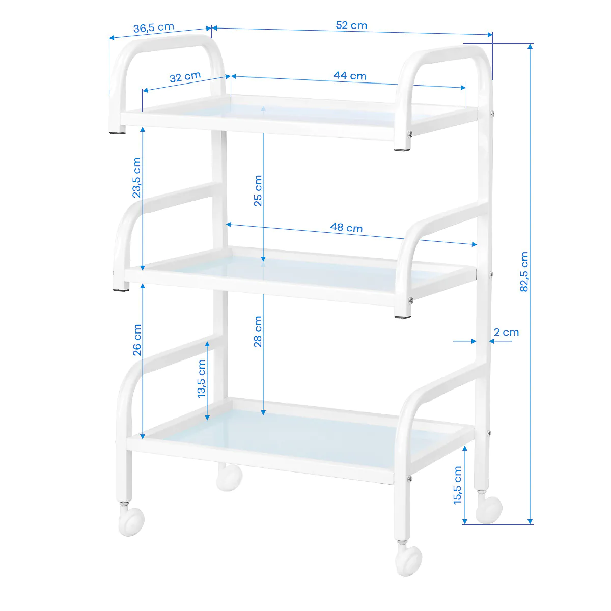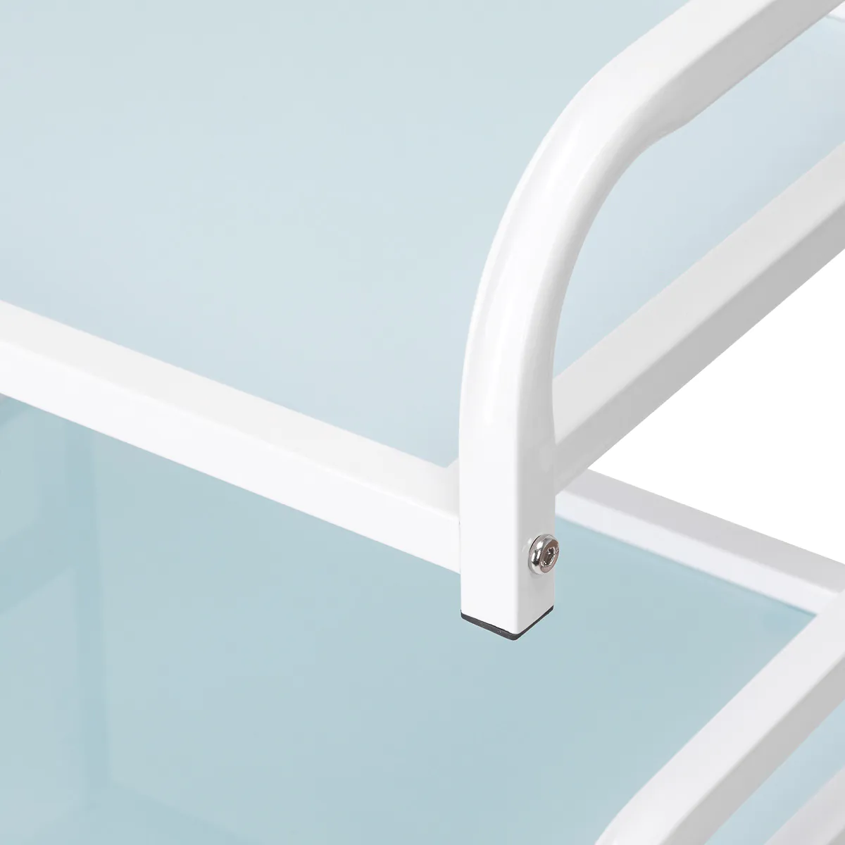 Patvaraus balto aliuminio rėmas ir stiklinės lentynos sukuria modernų ir estetišką visumą , kurią lengva valyti. Keturi ratukai užtikrina mobilumą, todėl lengviau sutvarkyti darbo vietą, o tvirtos medžiagos garantuoja stabilumą ir ilgaamžiškumą.
