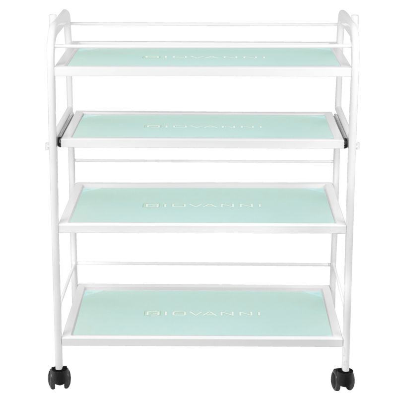 Stilingas ir funkcionalus vežimėlis su metaline konstrukcija bei stiklinėmis lentynomis. Baldas su ratukais ir viena ištraukiama lentyna – stabilus ir patogus sprendimas grožio salonams. Puikiai tinka kosmetologinės įrangos laikymui. Galima pritvirtinti didinamąją lempą bei kitus reikalingus priedus.