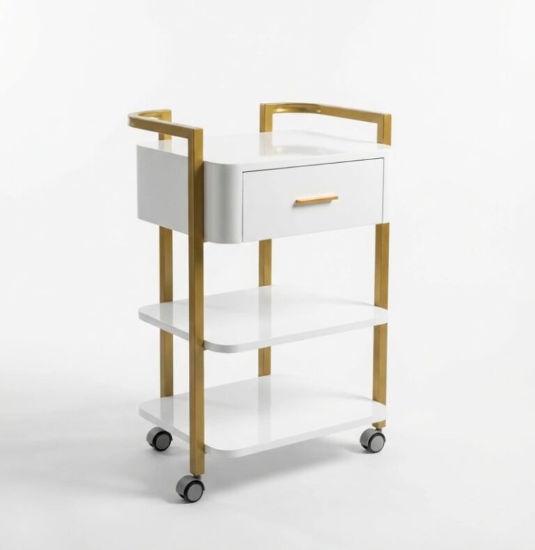 Kosmetologinis vežimėlis su stalčiumi, baltos spalvos su auksiniu rėmu