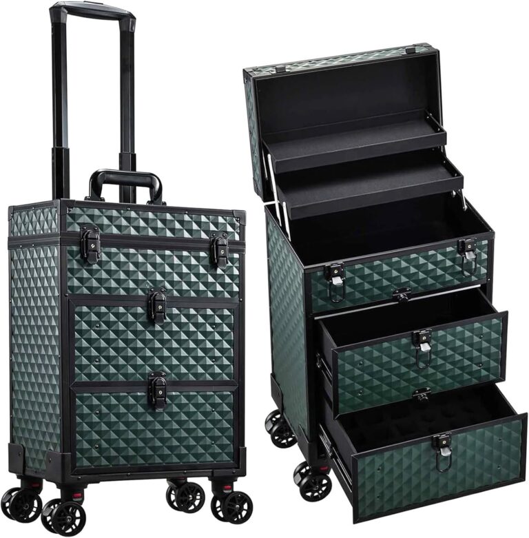 Kosmetologo lagaminas–vežimėlis su 2 stalčiais, su ratukais, rakinamas, tamsiai žalios spalvos