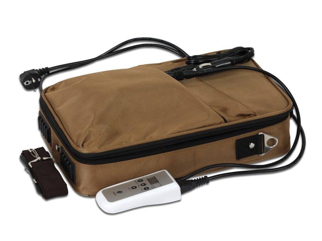 Nešiojamas krepšys akmenims šildyti, maitinamas iš elektros tinklo ir iš automobilio lizdo.
