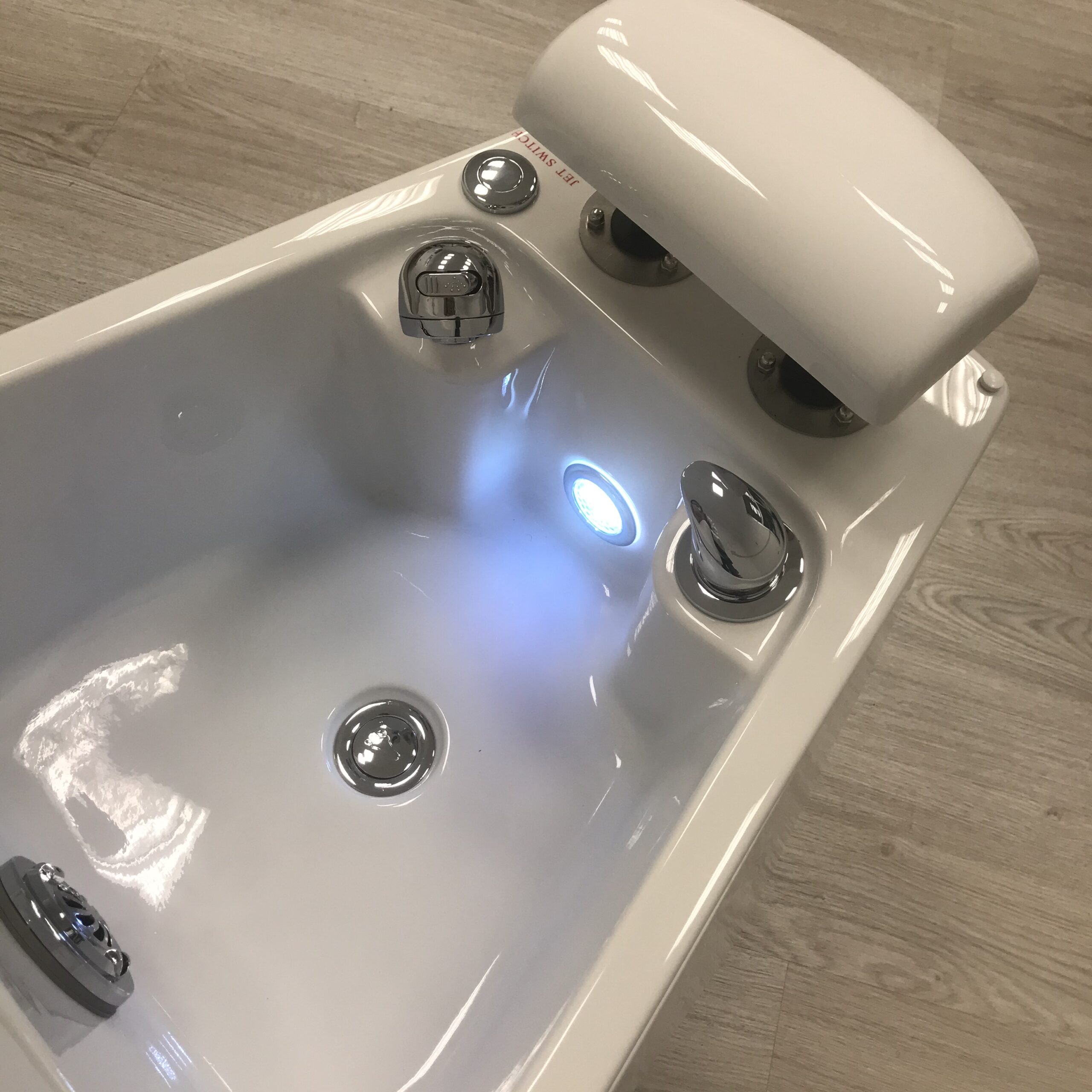 Pedikiūro vonelė turi integruotą chromoterapijos funkciją – vidinis LED apšvietimas švelniai keičia spalvas, sukurdamas atpalaiduojančią SPA atmosferą. Komplekte esantis chromuotas vienos svirties maišytuvas ir ištraukiama dušo galvutė užtikrina patogų ir profesionalų naudojimą. Vonelėje taip pat įmontuota reguliuojamo aukščio kojų atrama.