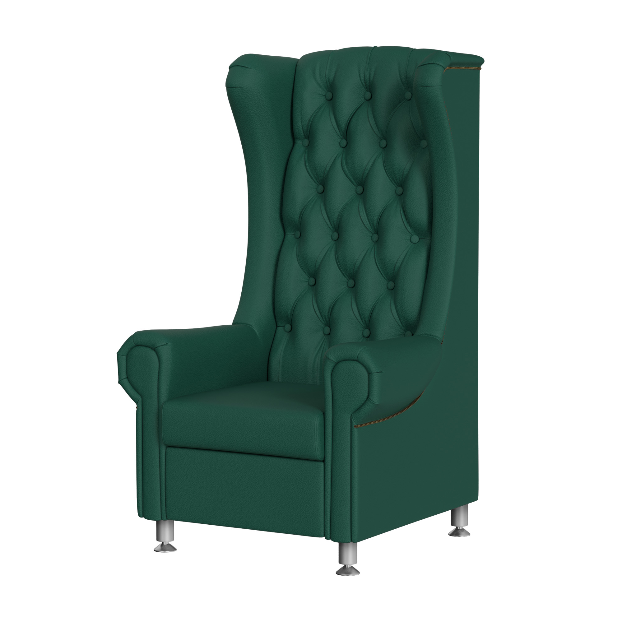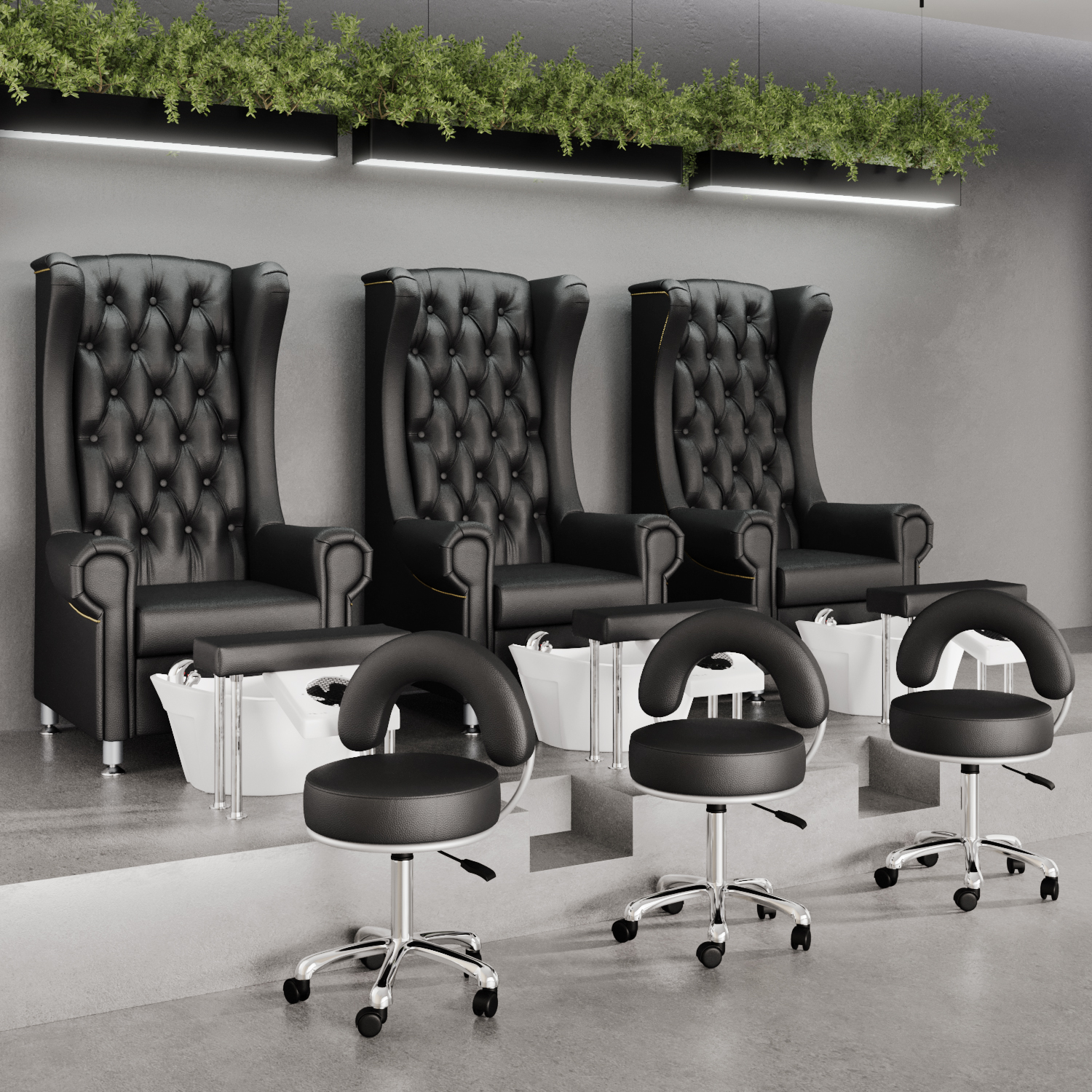 Aukštas atlošas, dekoruotas rankomis rištomis siūlėmis, sagomis, suderintomis su apmušalo spalva, ir elegantiški gvazdikų apvadai sukuria „sosto“ įspūdį. Fotelis gali būti montuojamas ant pakylos bei papildomas dekoratyviniu sluoksniu, pritaikant jį konkrečiai salono koncepcijai. Kliento patogumui galima pasirinkti kojų atramą ar akrilinę vonelę ir taip suformuoti pilną pedikiūro darbo vietos komplektą.