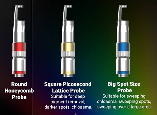 ✬ Mėlynas zondas: didelis taško dydis, tinkamas chloazmai šalinti, dėmėms naikinti ir didesnėms odos vietoms apdoroti.