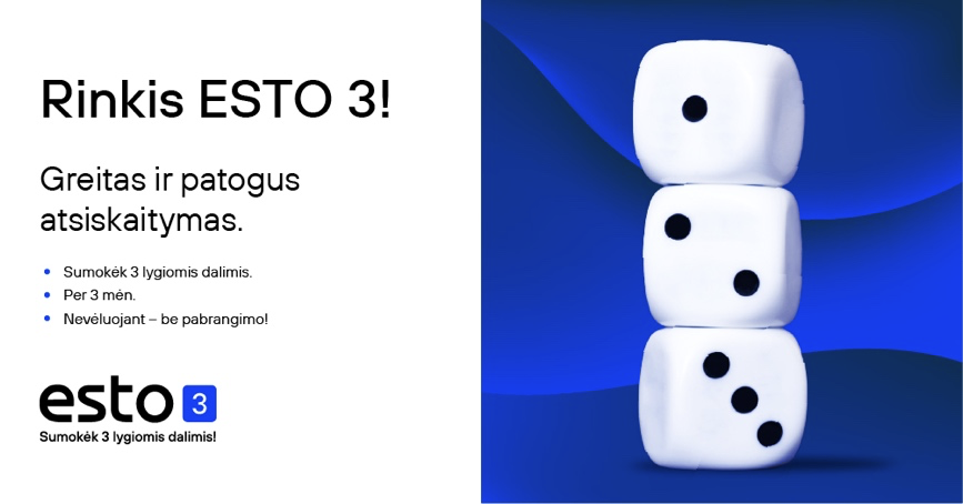 Su ESTO 3 galite apmokėti be pabrangimo, 3 lygiomis dalimis, per 3 mėn., jeigu laikysitės sutartyje nurodytų sąlygų!