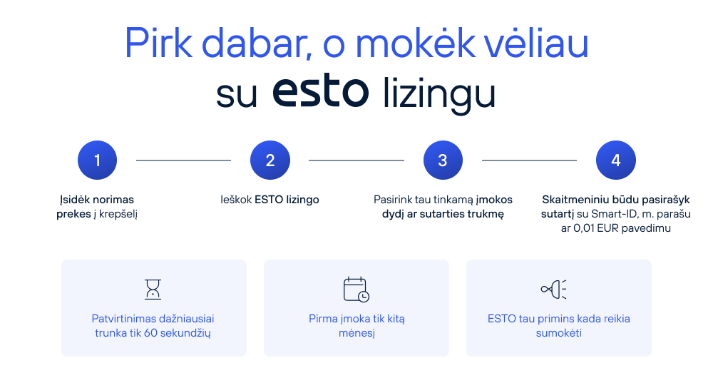 Reikės tik patvirtinti savo užsakymą, pasirinkti ESTO lizingas kaip atsiskaitymą, susipažinti su asmeninėmis paslaugos sąlygomis ir, skaitmeniniu būdu, pasirašyti pirkimo išsimokėtinai sutartį.