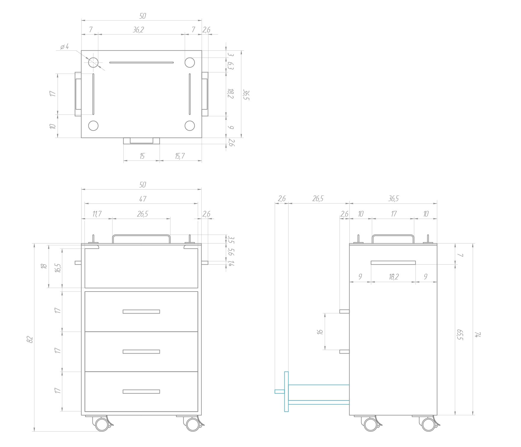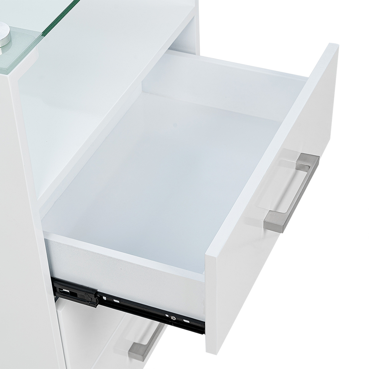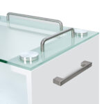 Korpusas ir stalčiai pagaminti iš MDF plokštės, lakuotos baltai. Viršutinė lentyna – stora, tvirta, iš stiklo, atspari chemikalams ir lengvai valoma. Metalinės rankenos. Guminiai (dervos) ratukai tyliai judėjimui.