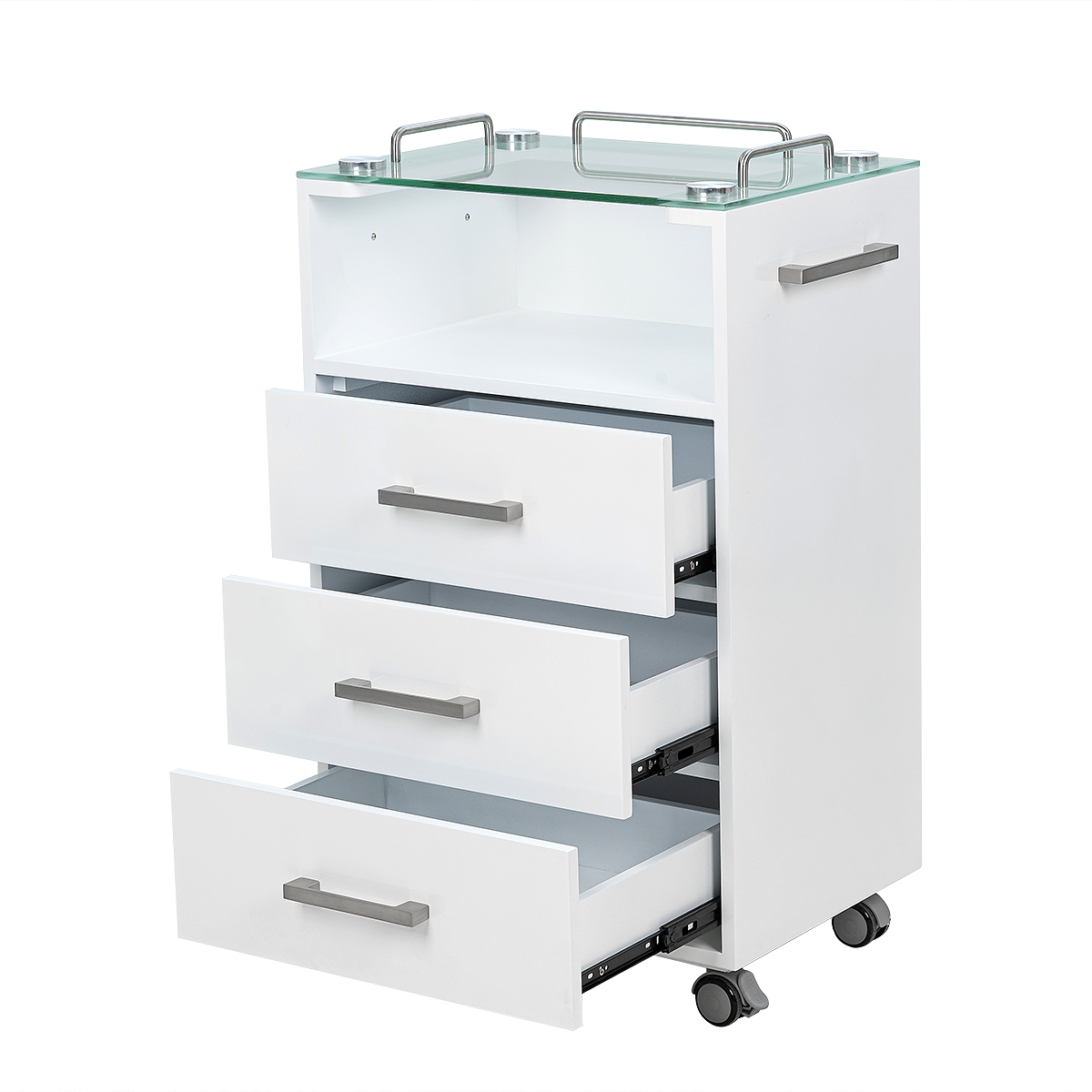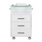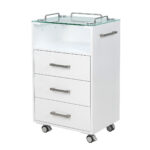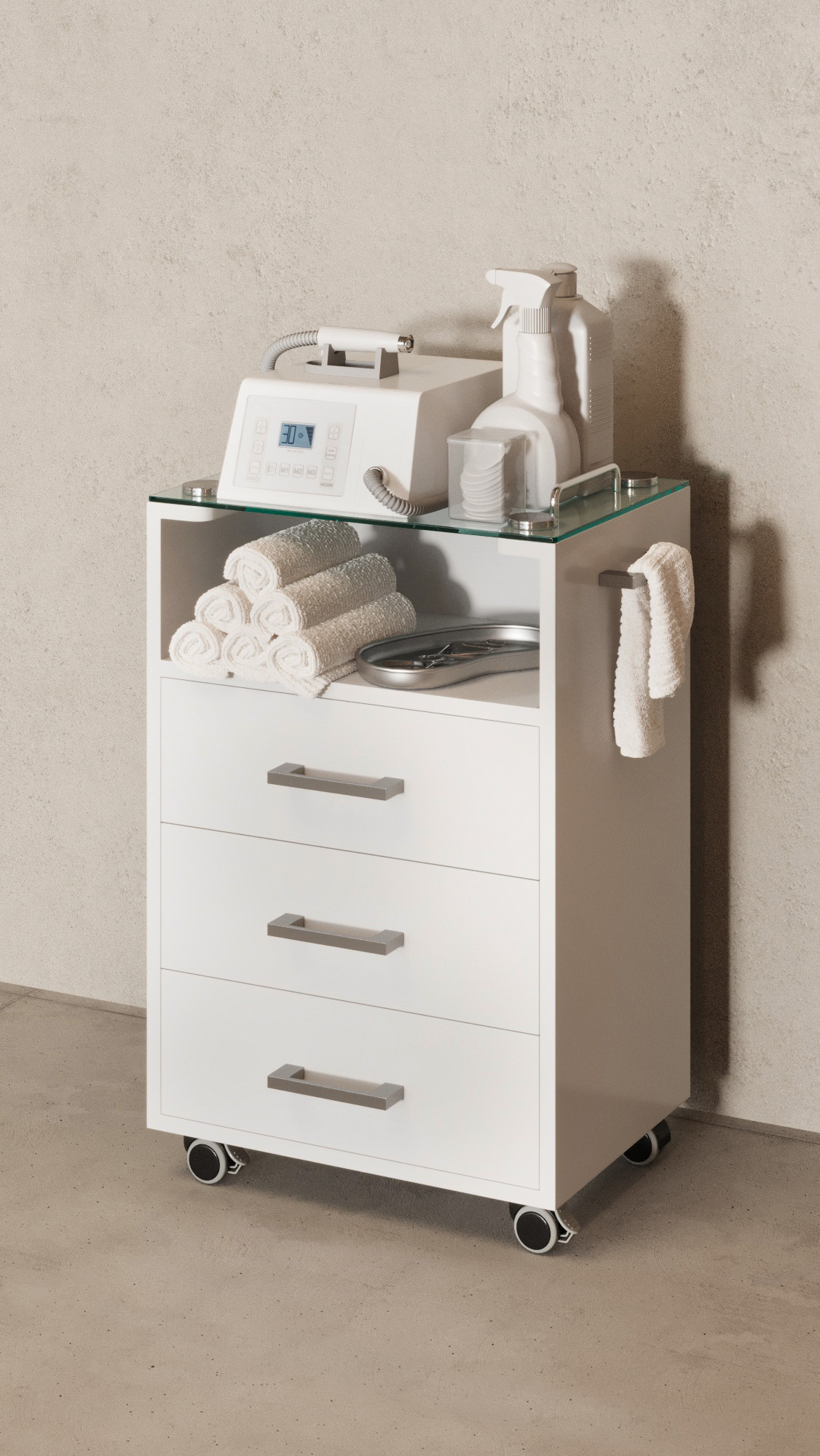 saugus, funkcionalus ir profesionalus pagalbinis vežimėlis, sukurtas intensyviam naudojimui grožio salonuose, manikiūro ir pedikiūro studijose. Aukštos kokybės MDF konstrukcija, lakuota balta spalva, suteikia elegantišką išvaizdą ir ilgaamžiškumą, o apgalvotas dizainas užtikrina patogų darbą procedūrų metu.
