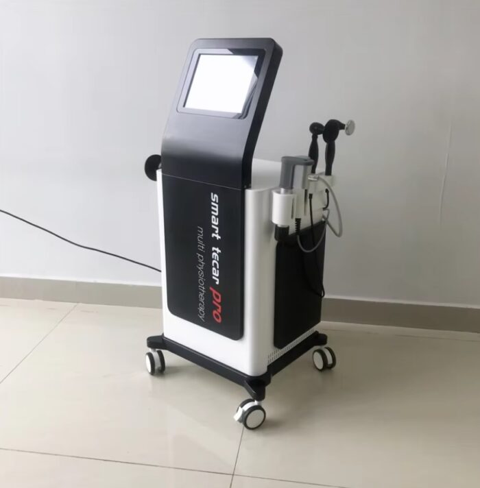 Fizinis ultragarsinis smūginės bangos procedūros įrenginys su RF Tecar sistema, skirtas efektyviai skausmo mažinimui.