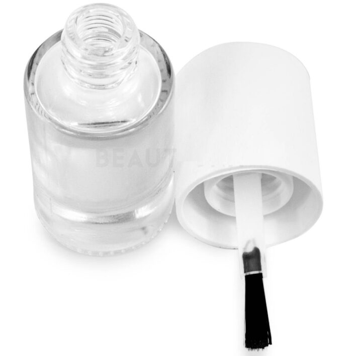 Tuščias stiklinis buteliukas su integruotu teptuku – puikiai tinka nagų lakui, odelių aliejui ar kitoms skystoms kosmetikos priemonėms laikyti ir patogiai tepti.